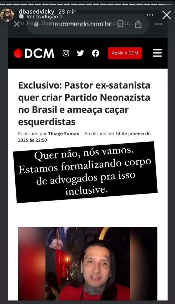 Ele publicou uma foto da matéria intitulada “Exclusivo: Pastor ex-satanista quer criar Partido Neonazista no Brasil e ameaça caçar esquerdistas” e cobriu o texto com a seguinte retificação: “Quer não, nós vamos (fundar o partido nazista). Estamos formalizando um corpo de advogados para isso, inclusive.”