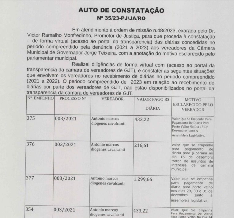 O promotor de justiça Dr. Victor Ramalho Monfredinho, recebeu a denúncia e solicitou diligencia virtual no Portal da Transparência referente aos períodos de 2021 a 2023, onde foi constatado a anotação de recebimentos de diárias pelos vereadores de GJT, apenas 2021 a 2022.