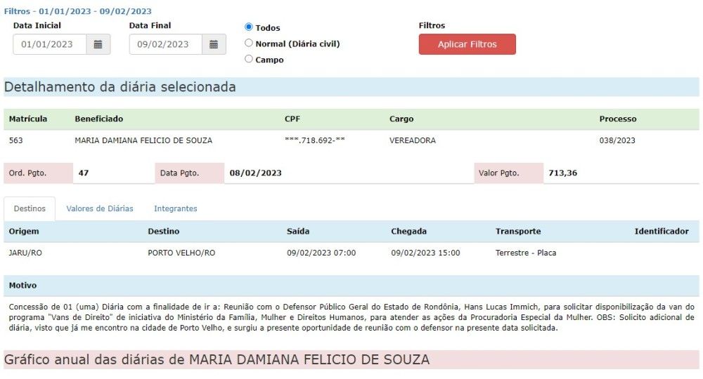 No caso da vereadora jaruense, Maria Damiana, a denúncia levada ao conhecimento do MP aponta que a vereadora solicitou adicional de diária no dia 09/02/2023, com o argumento que teria surgido uma oportunidade para ter uma reunião em Porto Velho, com Defensor Público Geral, Hans Lucas Immich.