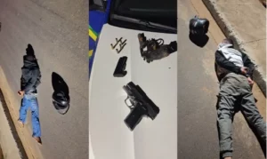 Na busca pessoal, foi localizado na cintura do jovem identificado como Lucas R., uma pistola calibre .380, além de um revólver calibre .38 próximo ao Ricardo M. Q. N. Após a imobilização dos detidos, outra guarnição chegou ao local para a condução dos presos.