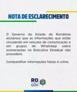 Mídia Rondônia – O Governo de Rondônia divulgou, neste domingo (9), uma nota oficial esclarecendo que são falsas as informações que circulam em alguns veículos de comunicação e grupos de WhatsApp sobre supostas exonerações no Executivo Estadual.