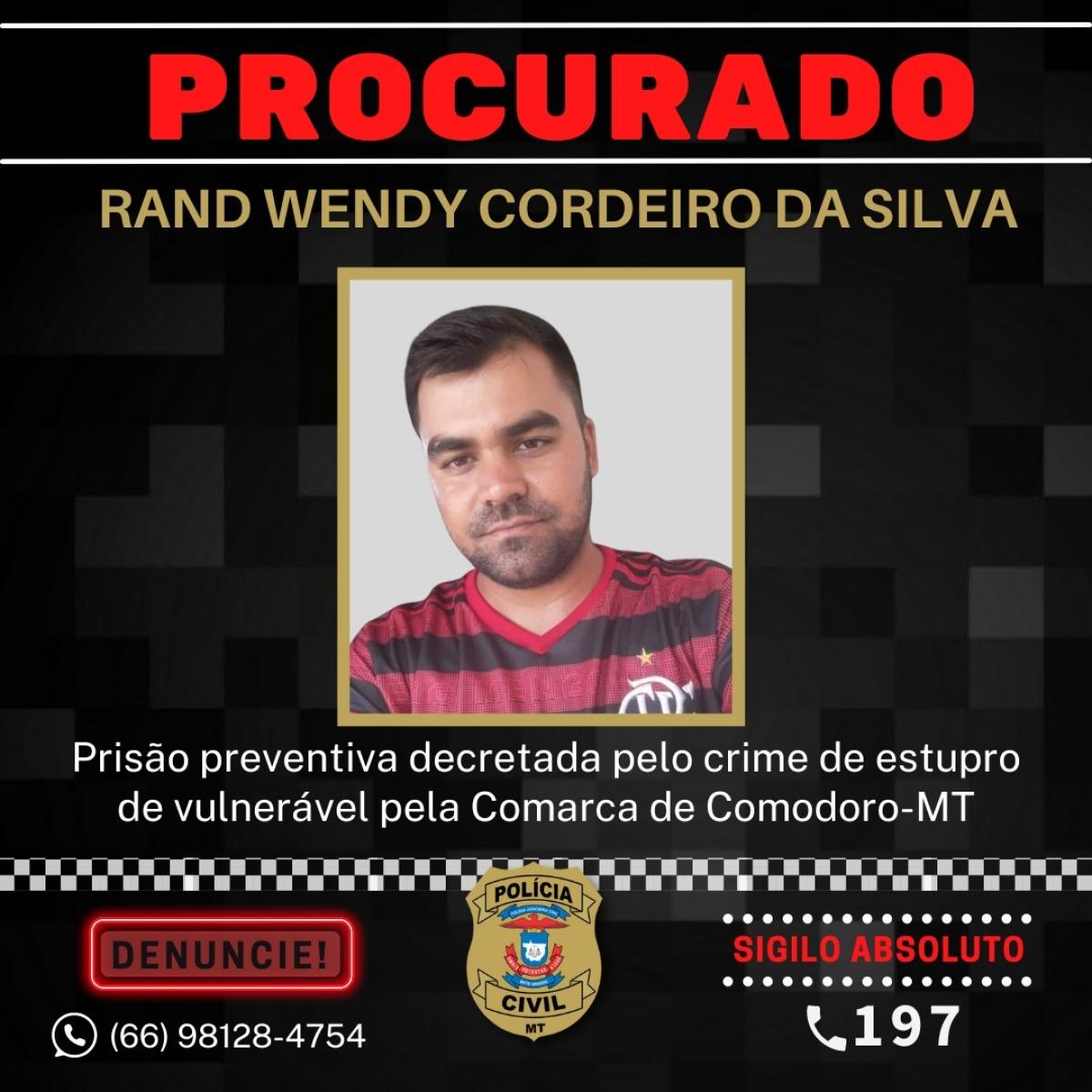 Rand Wendy Cordeiro da Silva, 31, está sendo procurado pela Polícia Civil de Comodoro (644 km ao oeste de Cuiabá), investigado por abuso sexual contra crianças. Ele é professor de futebol de um projeto social da cidade e já está com a prisão preventiva decretada. Duas vítimas já foram identificadas.