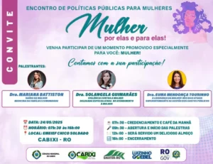 Com o tema “Mulher: por elas e para elas”, o Encontro de Políticas Públicas para Mulheres será realizado no próximo dia 24 de maio de 2025, na Escola Municipal EMEIEF Chico Soldado, em Cabixi, das 07h30 às 16h.