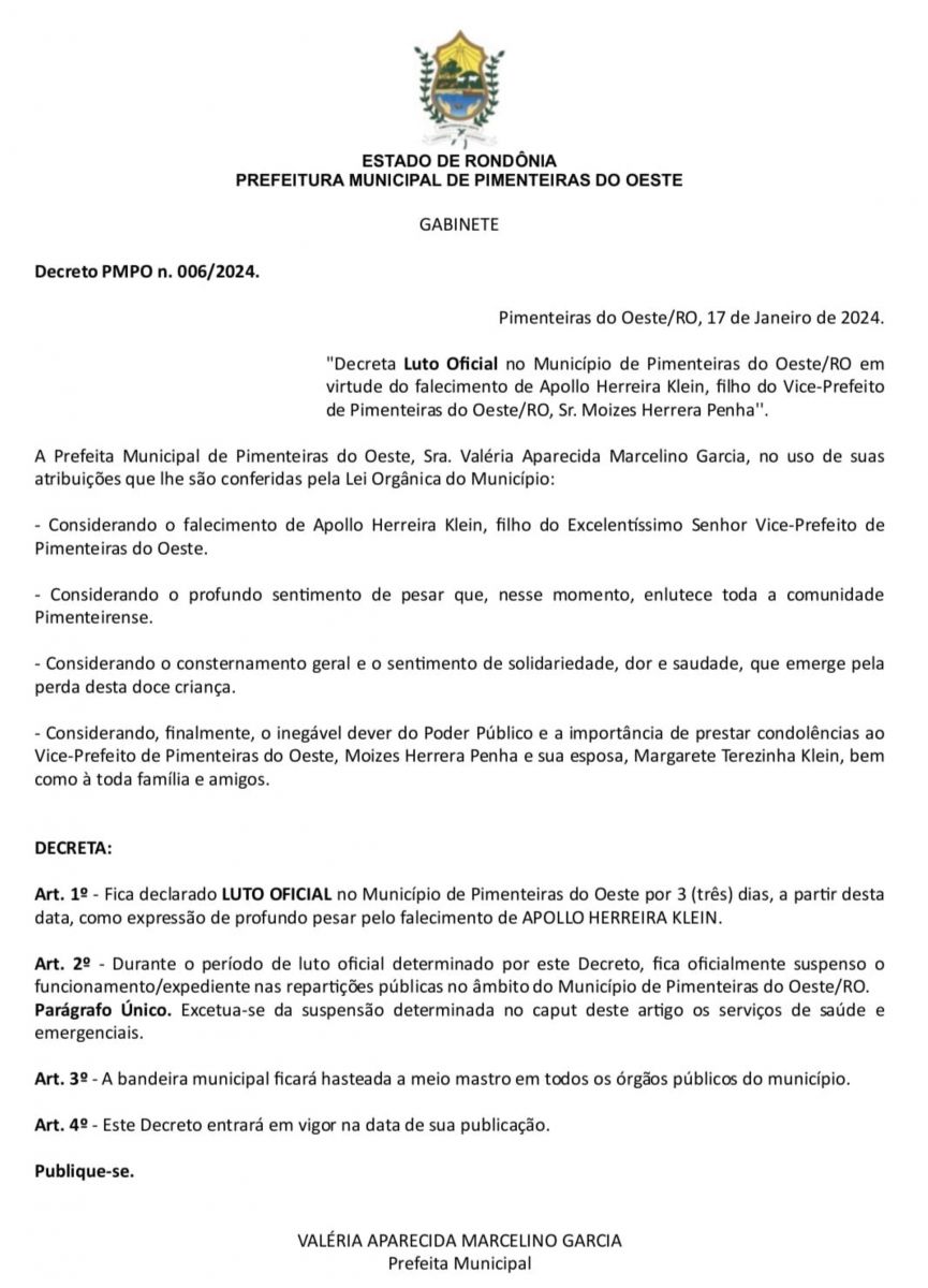 Mídia Rondônia – Abalada com a morte do jovem Apollo Herrera Klein, de 8 anos, a comunidade de Pimenteiras do Oeste vive nesta quinta-feira (18) momentos de dor com despedida do garoto. A prefeitura decretou três dias de luto e, em nota oficial enviada à imprensa, lamentou a tragédia que chocou a pequena cidade rondoniense. Apollo era filho do vice-prefeito do município, Moizés Herreira.