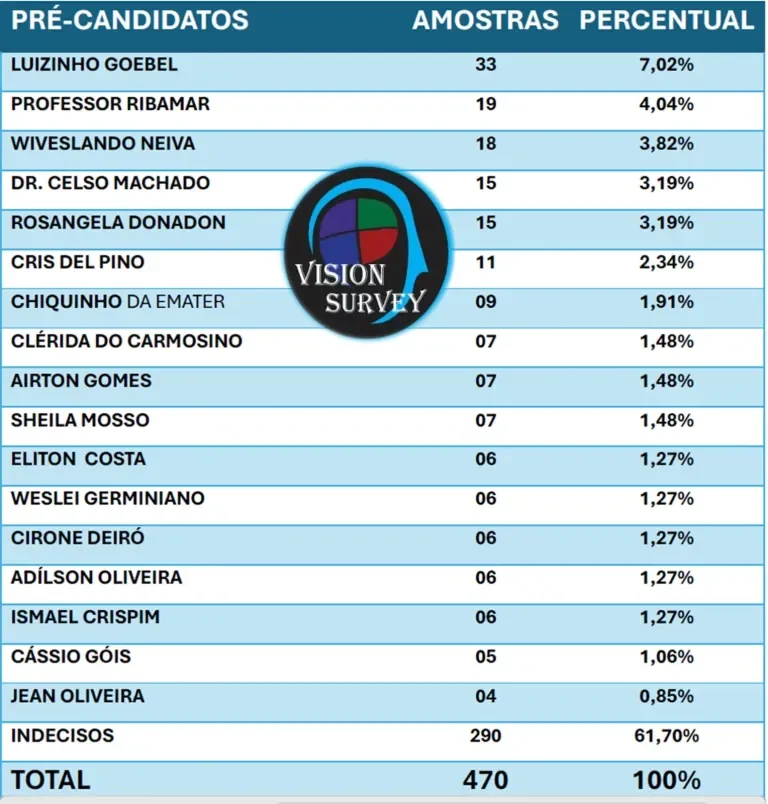 Uma pesquisa eleitoral realizada pelo Instituto Vision SurveY entre os dias 10 e 13 de setembro de 2025 destacou o nome do ex-prefeito de Colorado do Oeste por duas gestões, Professor Ribamar, como uma das principais lideranças políticas do Cone Sul de Rondônia. O levantamento ouviu 470 eleitores e apresentou margem de confiança de 95%.