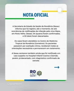 Mídia Rondônia – A Secretaria de Estado da Saúde (SESAU) confirmou quatro casos de Mpox, conhecida como varíola dos macacos, no estado de Rondônia. Ao todo, seis notificações da doença foram registradas em Porto Velho, sendo quatro confirmações e dois casos descartados.
