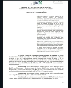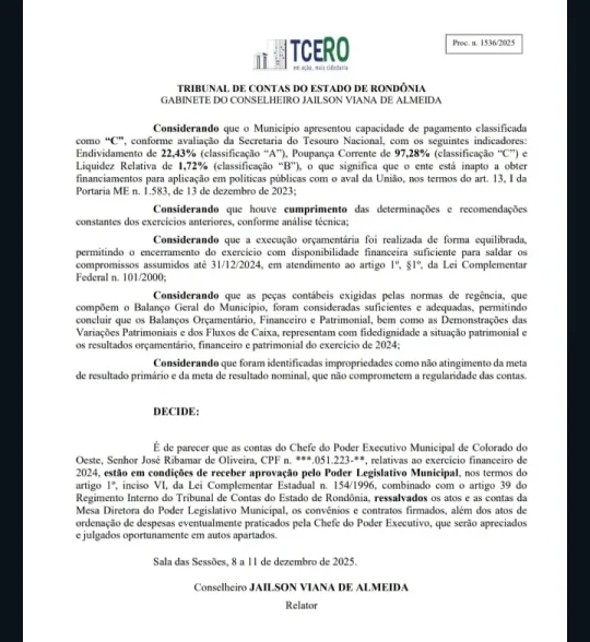Mídia Rondônia – O Tribunal de Contas do Estado de Rondônia (TCE-RO) emitiu parecer prévio favorável à aprovação das contas do Prefeito José Ribamar de Oliveira (Professor Ribamar), relativas ao exercício financeiro de 2024, após análise técnica detalhada da gestão fiscal, orçamentária, financeira e patrimonial do Município de Colorado do Oeste.