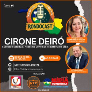 Mídia Rondônia – O deputado estadual Cirone Deiró será o entrevistado desta quinta-feira, 23, no Rondcast, programa de entrevistas transmitido ao vivo pelo jornal Mídia Rondônia e pela Norte TV, em parceria com a Unifatecie (Polo Vilhena). A entrevista vai ao ar a partir das 8h30 da manhã e será conduzida pela professora e mestre em Mídias Sociais, Anandreia Trovó.