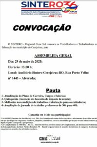 Para ampliar a discussão e ouvir diretamente a categoria, o Sintero já agendou uma assembleia com os servidores municipais de Cerejeiras. O encontro está marcado para a próxima quinta-feira, dia 29, às 15h, na sede do Sintero no município.