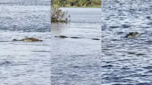 Nas imagens, o enorme animal se aproxima da área onde havia banhistas, impressionando pelo tamanho e pela imponência. Apesar do susto, não houve registro de ataques.